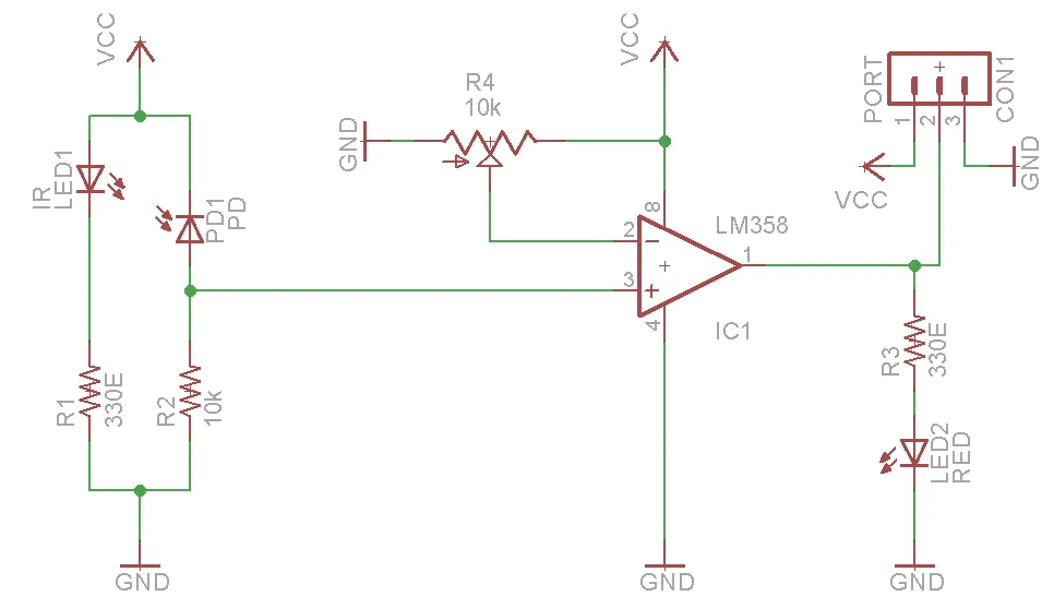 At this point, your schematic should contain a bunch of randomly arranged, unconnected parts. Click the wire tool in the right-side toolbar of your editor, and wire the parts together. This connects them electrically.