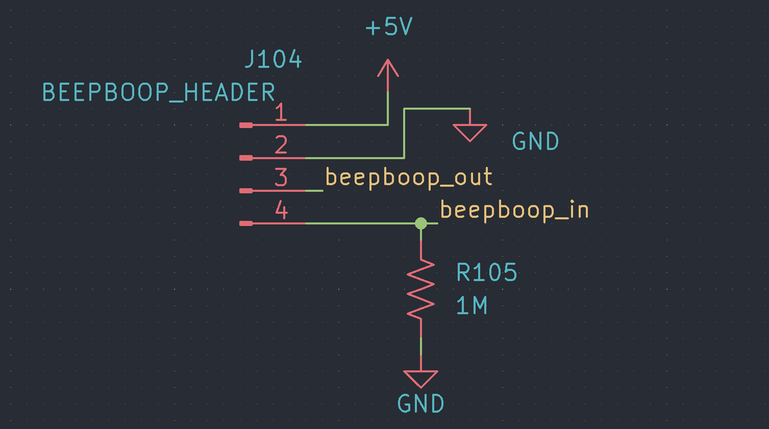 Thus far we haven't had a ton of connections between components, and there haven't been that many components to connect to. That goes away for larger designs, which will turn into a ratsnest of chaos if we only connect things with wires. We'll need some notation to help us keep our schematics tidy and legible. The electrical engineers of yore decided that the best way to do this was by putting a label next to the wire to label the signal - and when we want to use this signal elsewhere, we just put the same label next to that wire, making them electrically connected. This means that everything with the same name is electrically connected.