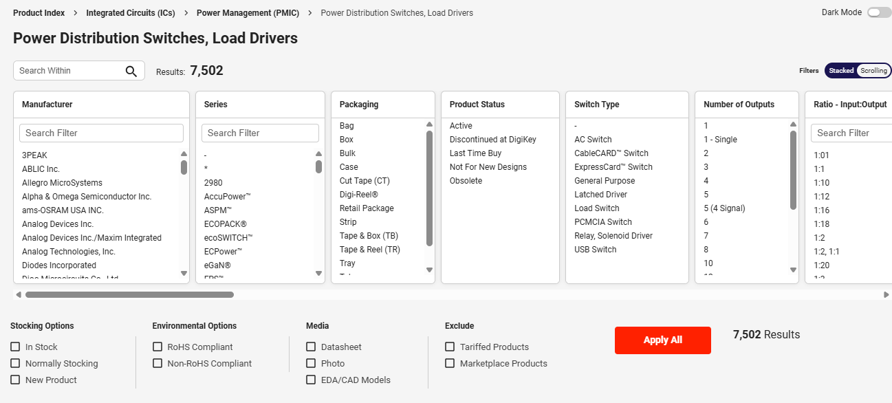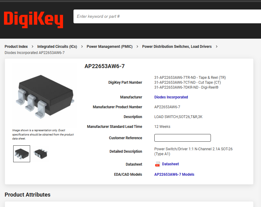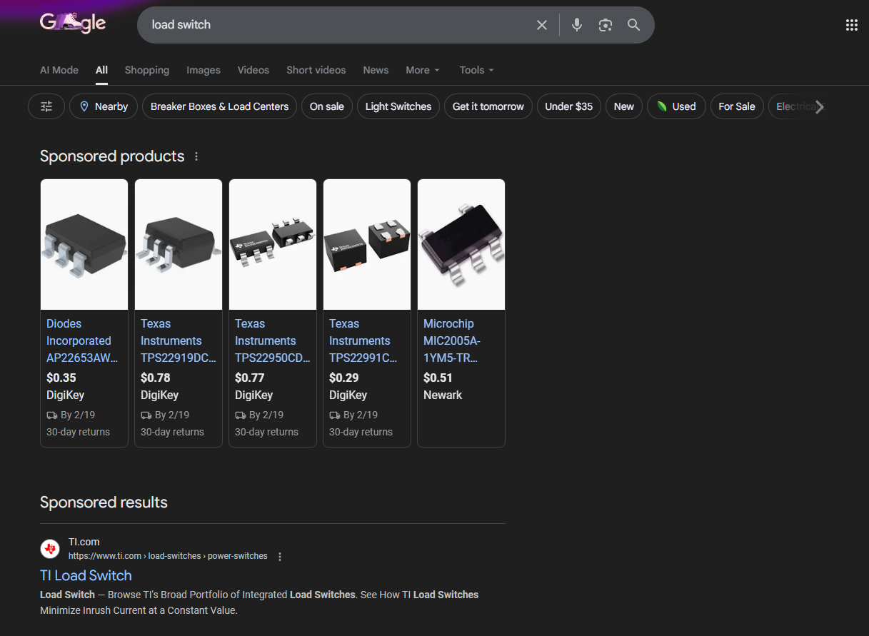 Our first step is to find the right section in digikey. I tend to go to google and search for my term "load switch".