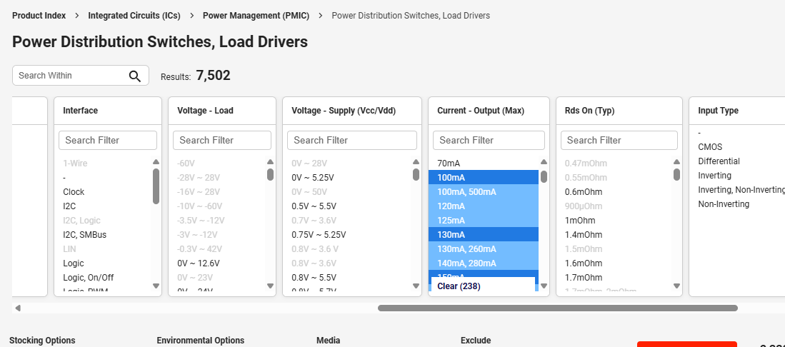 After I downselect on RDS(ON), Output Configuration (High side), and Interface (Logic or On/Off), I still have 1276 parts.