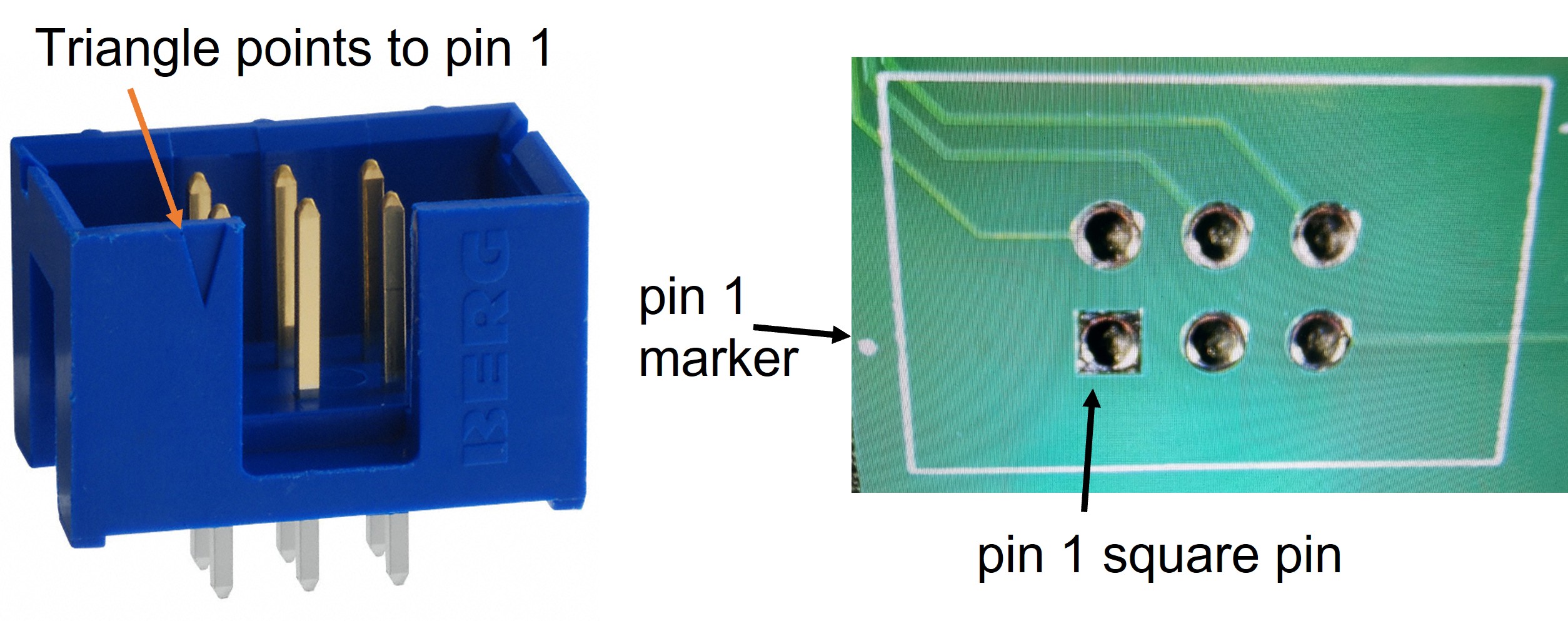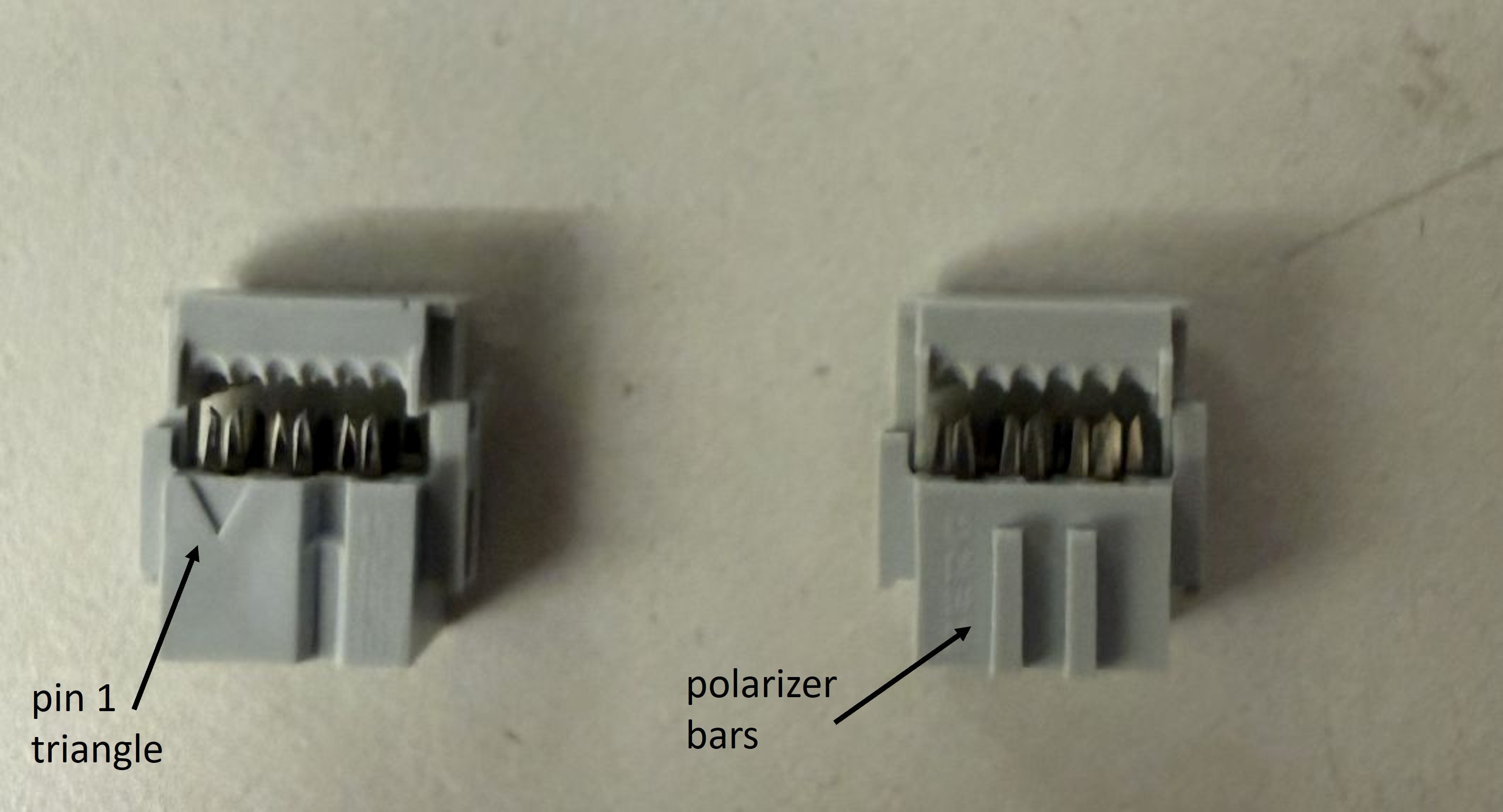 - Grab two 6-pin IDC connectors. We have two types. One has a little triangle indicating pin 1. The other has two little bars that polarize the connector, allowing the connector to fit into the housing in only one orientation. I prefer the latter as it prevents connection mistakes and frying my board.