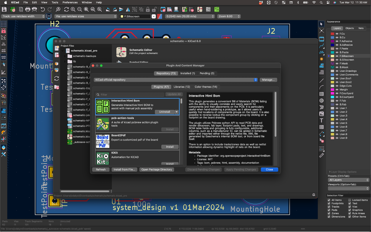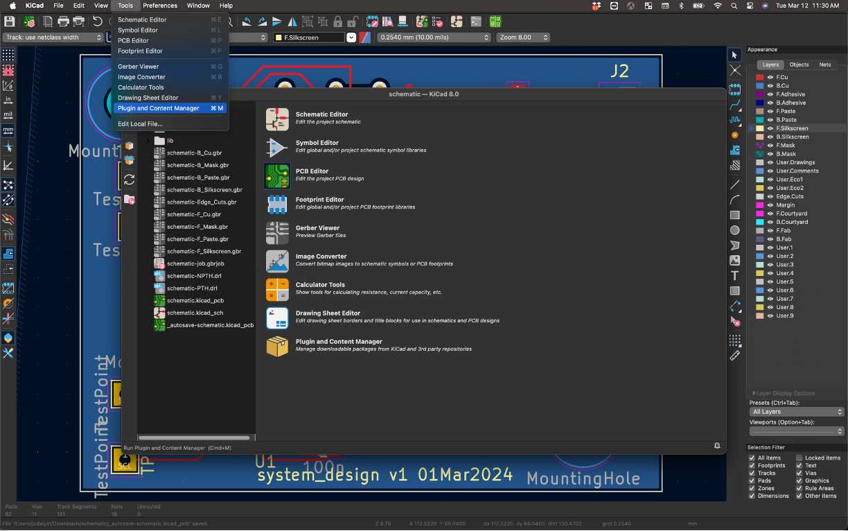 KiCad has a really neat plugin that can be activated which provides an easy-to-read "GUI" of your board and its components and elements. It can be very helpful in the assembly that you'll be doing. To install, first go into your main KiCad page and Tools -> Plugin and Content Manager.